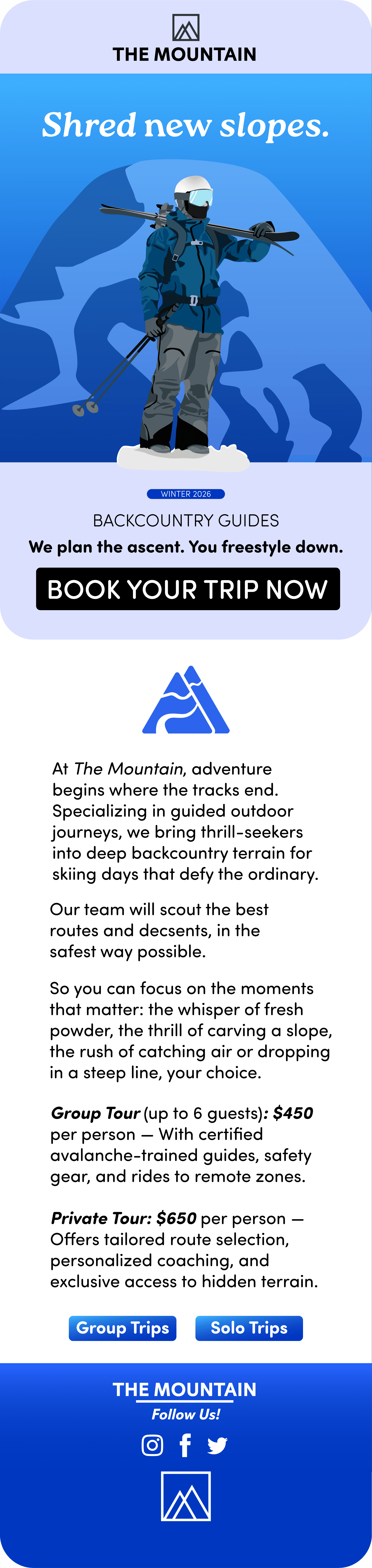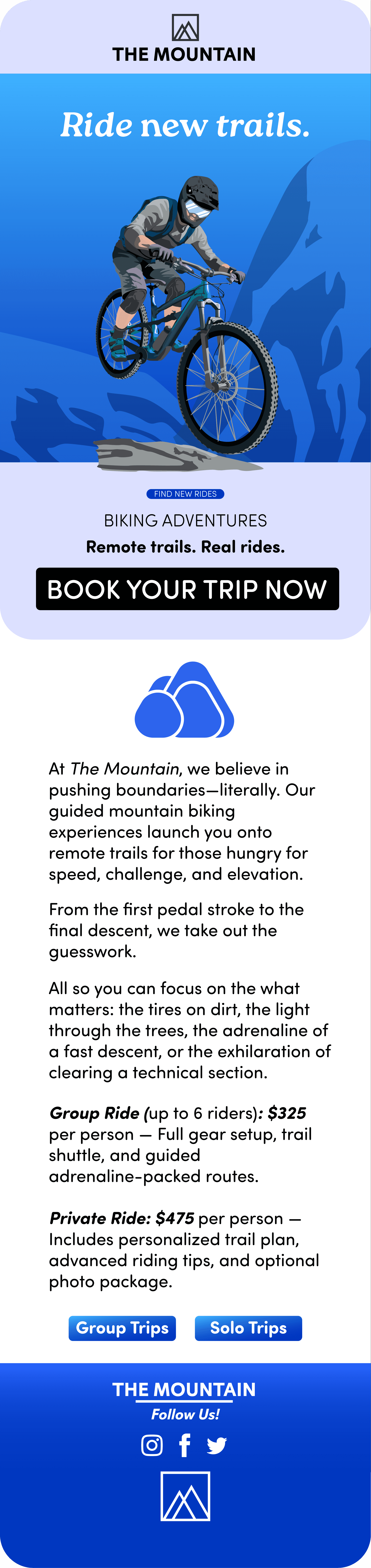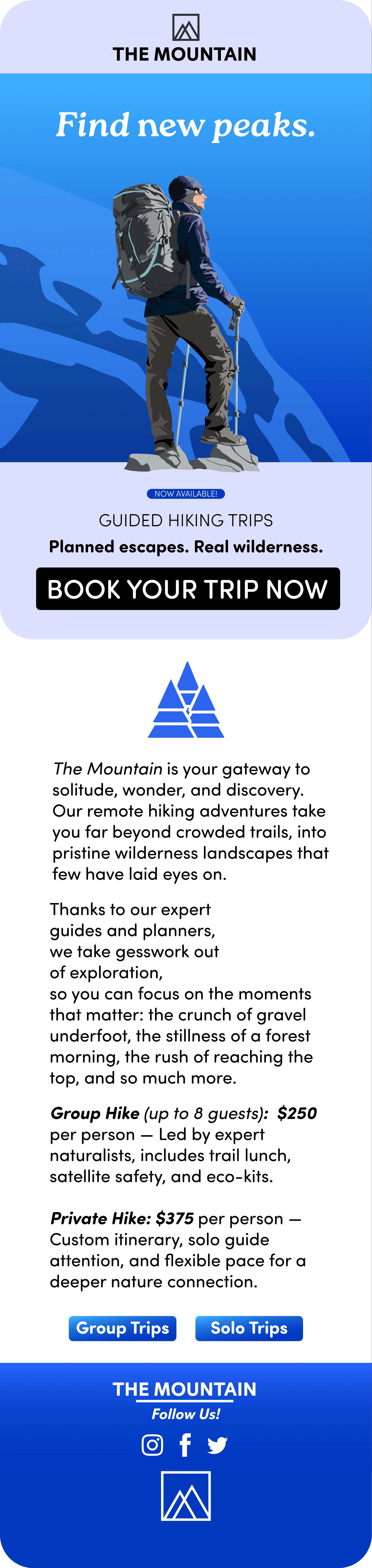 Utilizing previous work as main assets, I created a mockup of a short email campaign for a fictional company that provides outdoor tours